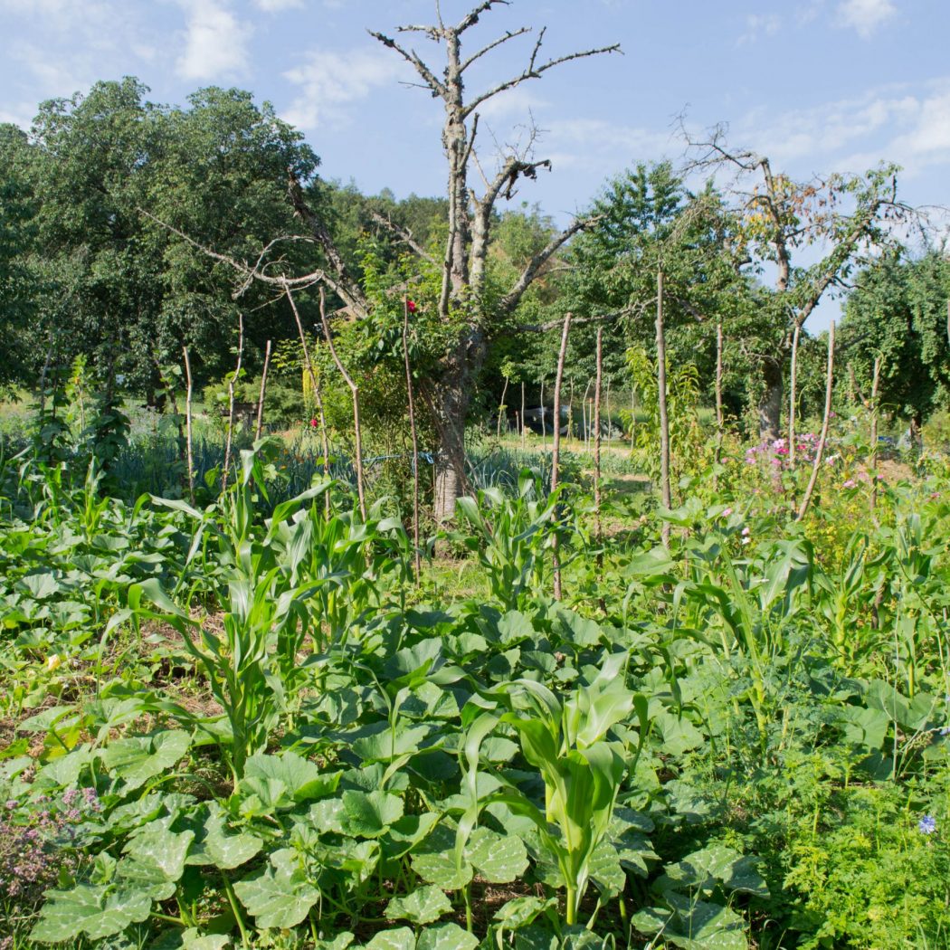 Durch das Zusammenspiel verschiedener Elemente und Techniken gärtnern wir in einem produktiven und resilienten Ökosystem. Wir bauen einen Waldgarten, einen Gemüsegarten, einen Kompostgarten und einen Pilzgarten an – Ansätze, die unserem lokalen Ökosystem Diversität und naturnahe Strukturen verleihen.